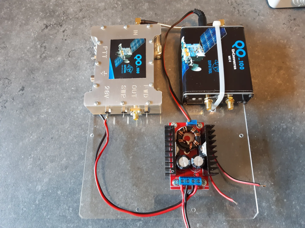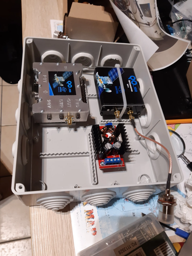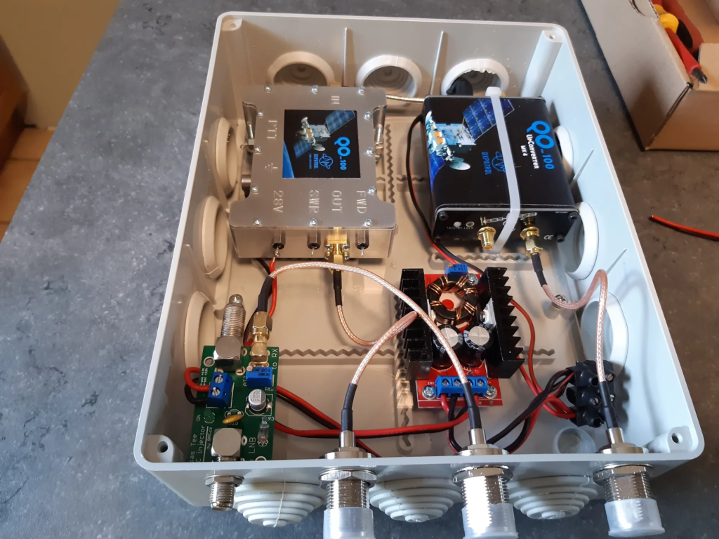 Une fois le matériel réceptionné en quelques jours , j’ai pu le weekend suivant procéder à la mise en place des différents éléments dans une boite type « PLEXO » permettant l’émission et la réception des Signaux QO-100 et sur le deuxième weekend procéder aux différents tests.